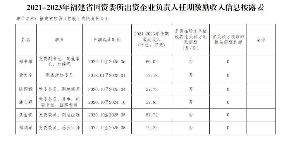 2021-2023年福建省國資委所出資企業(yè)負(fù)責(zé)人任期激勵收入信息披露表