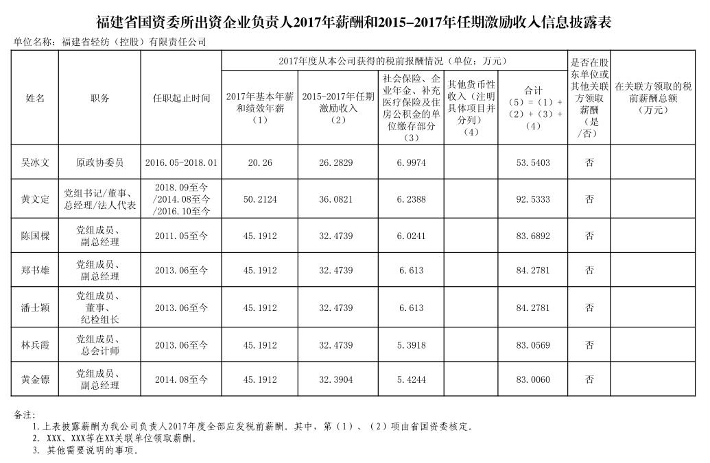 福建省輕紡(控股)有限責(zé)任公司負(fù)責(zé)人2017年薪酬和2015-2017年任期激勵(lì)收入信息披露表